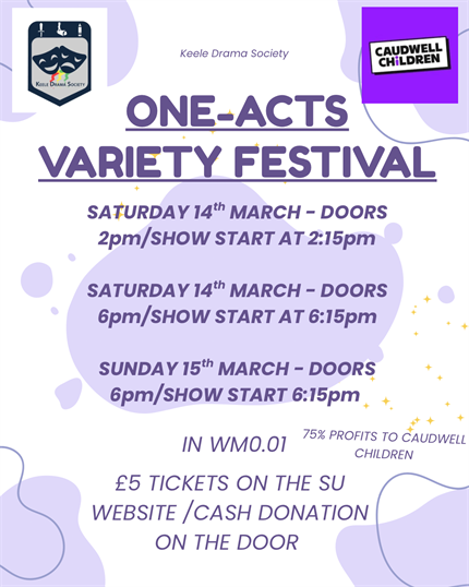 Come along and see our variety show consisting of student-written plays, singing and poetry! Tickets are available for £5 online (please look in our products section on the Keele Drama Society page) or any amount of cash on the door!! 75% of all show profits will be donated to Caudwell Children.